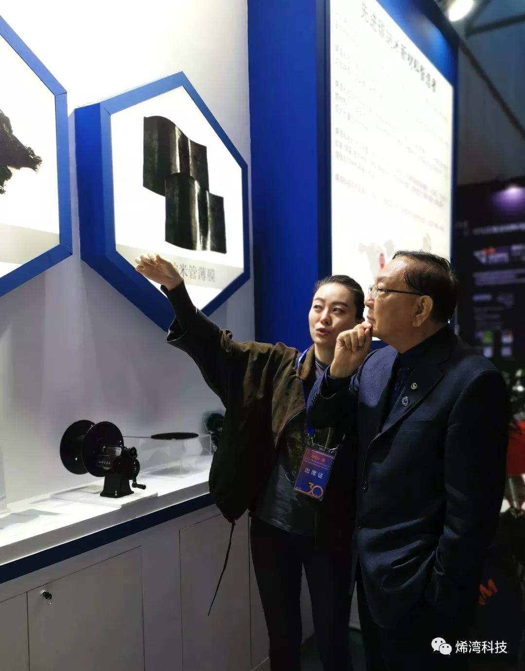展会期间,中国工程院院士杜善义先生与国家纳米科学中心“纳米制造与应用基础”研究室张忠主任,一起来到烯湾科技展位详细了解产品情况。杜善义院士作为我国复合材料的开创者之一,是力学、复合材料、航空航天专业的“跨界”专家,在行业内享有极高的声誉。杜善义院士对于烯湾科技自主研发生产的碳纳米管系列产品的优良特性给予了高度肯定,看好碳纳米管纤维未来在复合材料上的发展前景,同时也表示,希望有机会能够去到烯湾科技深圳总部进行参观交流。