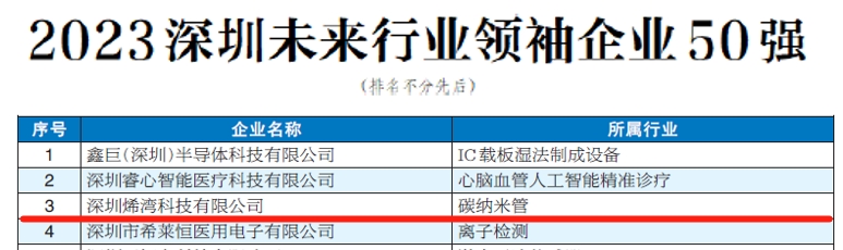 深圳未来行业领袖企业50强由深圳市工商业联合会(总商会)、深圳报业集团指导,深圳市行业领袖企业发展促进会与深圳商报/读创共同主办,旨在评选出在未来行业具有领先优势、高成长性、高创新性的企业,推动深圳经济高质量发展。烯湾作为细分领域的国家专精特新“小巨人”企业,凭借强大的自主创新能力、积累的关键核心技术以及清晰的发展战略,成功入围深圳未来行业领袖企业50强榜单。